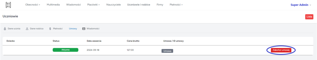 1. Zakończyć/zarchiwizować umowę z poprzednią placówką (może to zrobić tylko SuperAdmin)